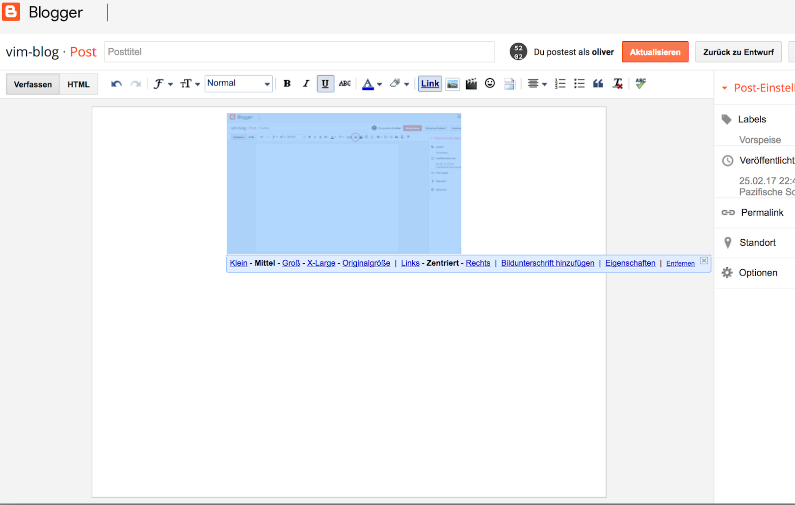 AntwortenLöschenDu kannst in blogspot.com ziemlich simpel beliebig Bilder direkt im Editor hochladen: